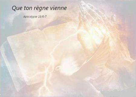 Oui ; Seigneur, " Que ton règne vienne "! (Matthieu 6/10).Cette prière monte spontanément de nos coeurs, lorsque nous entendons parler de guerre et d'oppression. Nous soupirons après la venue du royaume de Dieu qui apportera la justice, la paix et la prospérité. !
